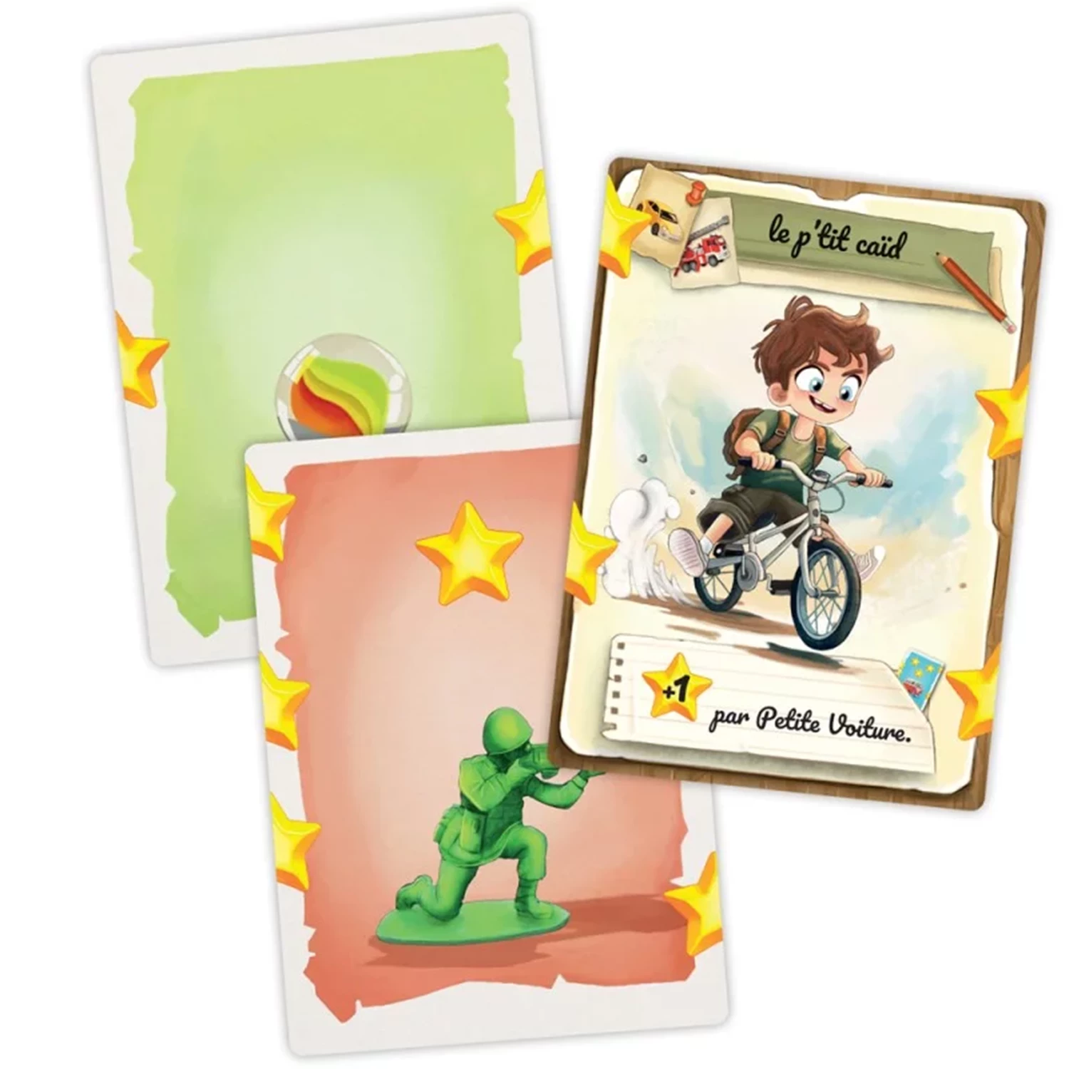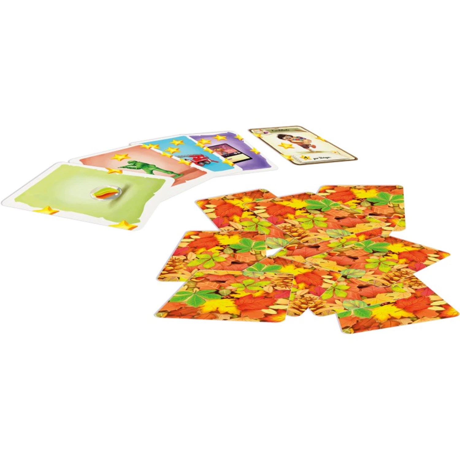 C’est la rentrée des classes, l’automne est là et la cour d’école est tapissée de feuilles mortes. Sous les feuilles, de petits jouets ont été perdus avant les vacances d’été. Vous devrez fouiller dans le tas de feuilles pour retrouver les jouets perdus et réaliser la meilleure collection. A votre tour, vous pourrez retourner 3 cartes feuilles et découvrir ce qui s’y cache. Vous pourrez en garder une mais vous devrez aussi en donner une à un autre joueur, avant de remettre la troisième sous le tas de feuilles. Votre identité secrète sera révélé à la fin de la partie. Incarnez l’un des huit personnages de la cour d’école tout en cachant votre identité pour marquer plus d’étoiles que les autres!