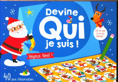 Est-ce que ton lutin a un bonnet ? Est-ce que ton Père Noël a les joues rouges ? Les enfants trouveront dans ce livre 40 planches de jeu, toutes différentes. Le but du jeu est d’identifier en premier le personnage choisi par l’adversaire. Chacun à leur tour, les joueurs posent une question à laquelle l’adversaire devra répondre par oui ou non. Un rabat sur la couverture forme un chevalet pour masquer les planches de jeu. Un jeu d’observation et de déduction, très amusant, idéal pour enrichir son vocabulaire. Un bloc à emporter partout, pour jouer à deux, avec juste un crayon.