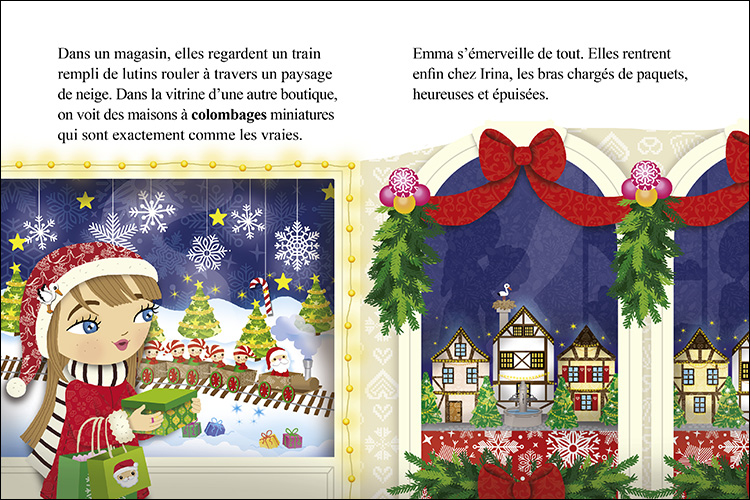 Emma se rend au célèbre marché de Noël de Strasbourg avec sa mère. Elle s’émerveille de tout : les petits chalets en bois, les décorations qui illuminent la ville… Elles rapportent des boules en verre pour décorer leur sapin de Noël. Mais quand le petit frère d’Emma le renverse, c’est la catastrophe. Heureusement, la magie de Noël n’est jamais loin…