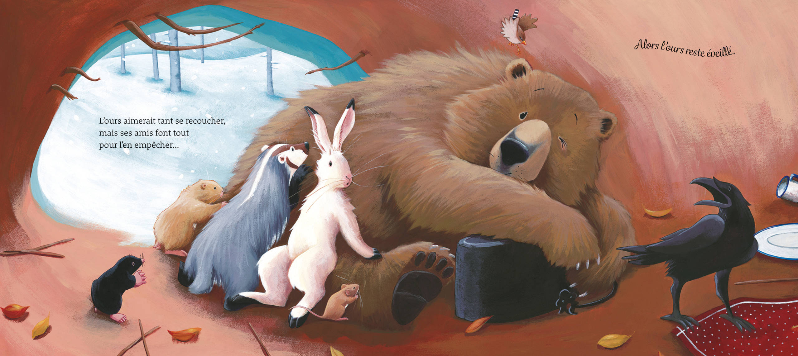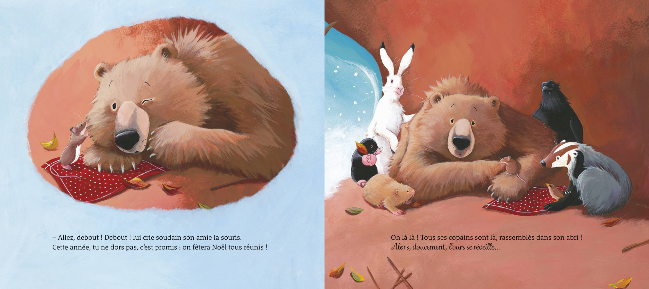 Demain, c’est Noël… Bien au chaud dans sa caverne douillette , Ours brun dort profondément. “Debout, debout Ours brun !” crie soudain le souriceau. Cette année, ses amis de la forêt sont bien décidés à célébrer  Noël tous ensemble ! Il y a tant de choses à faire… Choisir le sapin, décorer la caverne… Ours brun a bien du mal à rester éveillé ! Et pourtant, lors de la nuit de Noël, il surprendra tous ses amis !
