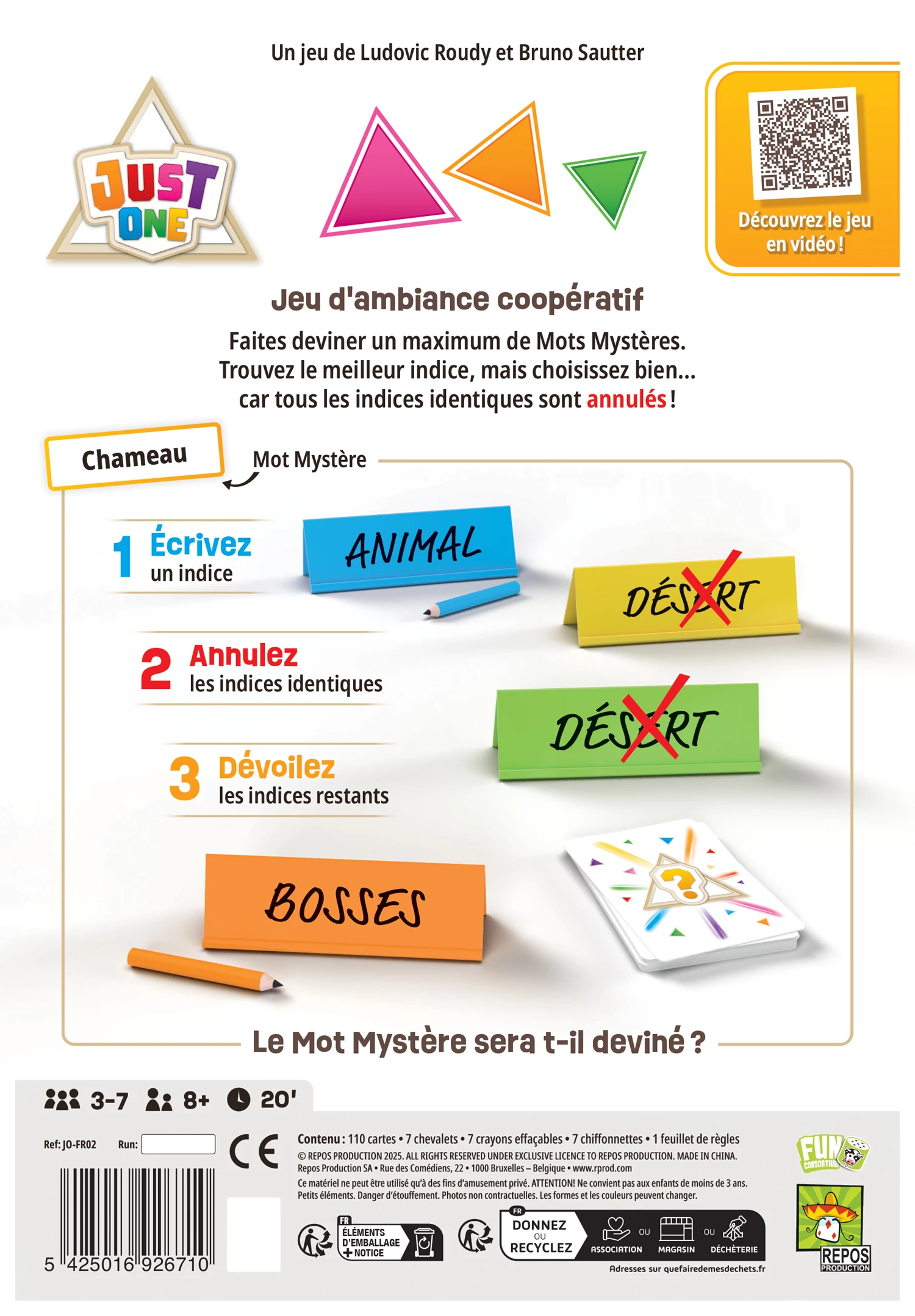 Vous avez le choix, faites la différence! Just One est un party game coopératif ou vous jouez tous ensemble pour découvrir le plus de mots mystères. Trouvez le meilleur indice pour aider votre équipier et soyez original, car tous les indices identiques seront annulés !
