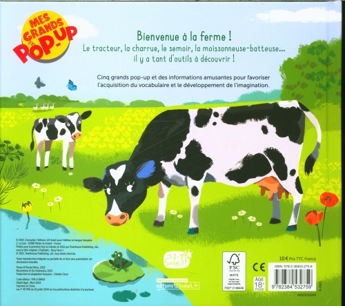 Bienvenue à la ferme ! Le tracteur, la charrue, les vaches, les moutons, le semoir, la moissonneuse-batteuse… Les enfants vont découvrir la ferme et ses engins impressionnants grâce à 5 grands pop-up qui donnent vie aux illustrations. Les pop-up et des textes courts favorisent l’acquisition du vocabulaire et le développement de l’imagination.