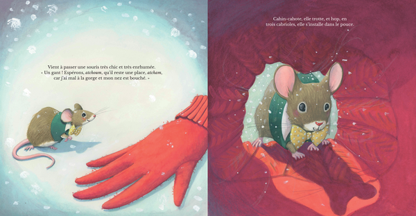 Un jour d’hiver, une souris trouve pour son plus grand bonheur un gant égaré où se réfugier. Elle est rapidement rejointe par d’autres animaux qui se faufilent dans chaque doigt. Mais comment accueillir la biche une fois que le gant est entièrement occupé ?