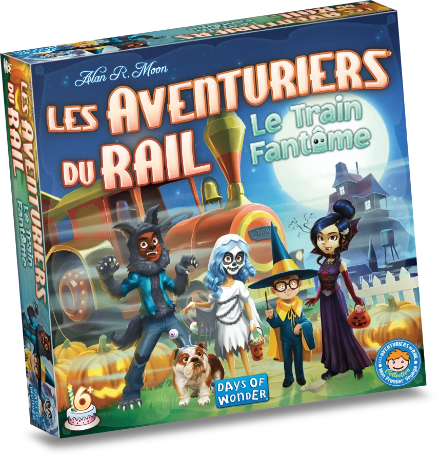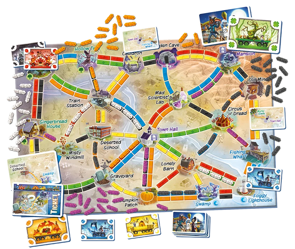 Dans cette version horrifique du classique Les Aventuriers du Rail : Mon Premier Voyage, parents et enfants collectent des cartes Parade et placent leurs chariots hantés sur le plateau pour relier les différents emplacements de cette bien étrange petite ville.