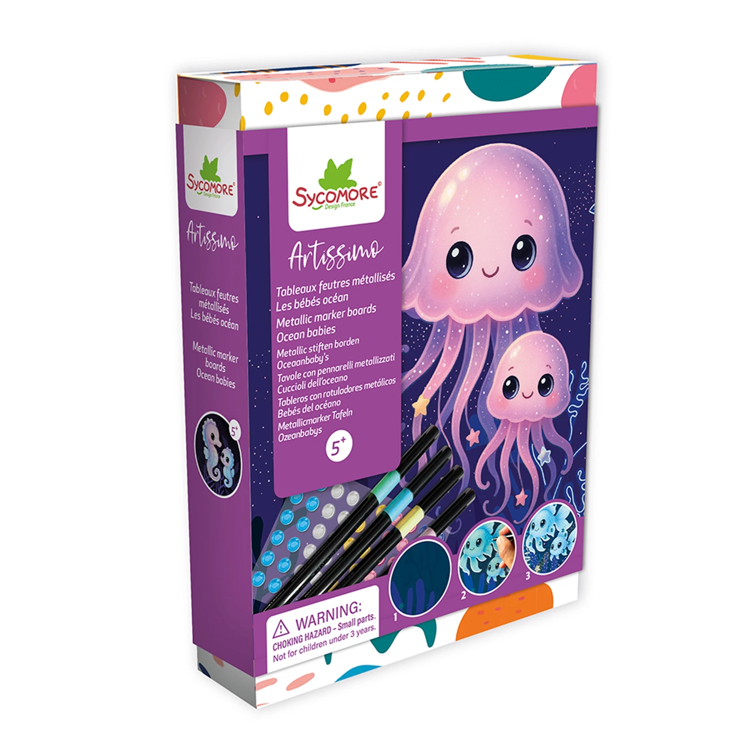 5 tableaux de couleurs foncées pré–imprimés à colorier et à décorer grâce aux 4 feutres métallisés et 100 gems.