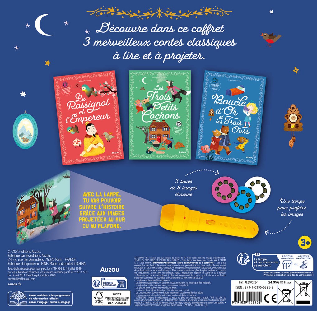 Grâce à ce coffret, (re)découvre trois contes merveilleux. Il contient trois jolis livres et une lampe pour projeter les images au plafond ou sur le mur. C’est le coffret parfait pour faire de la lecture du soir un moment magique!