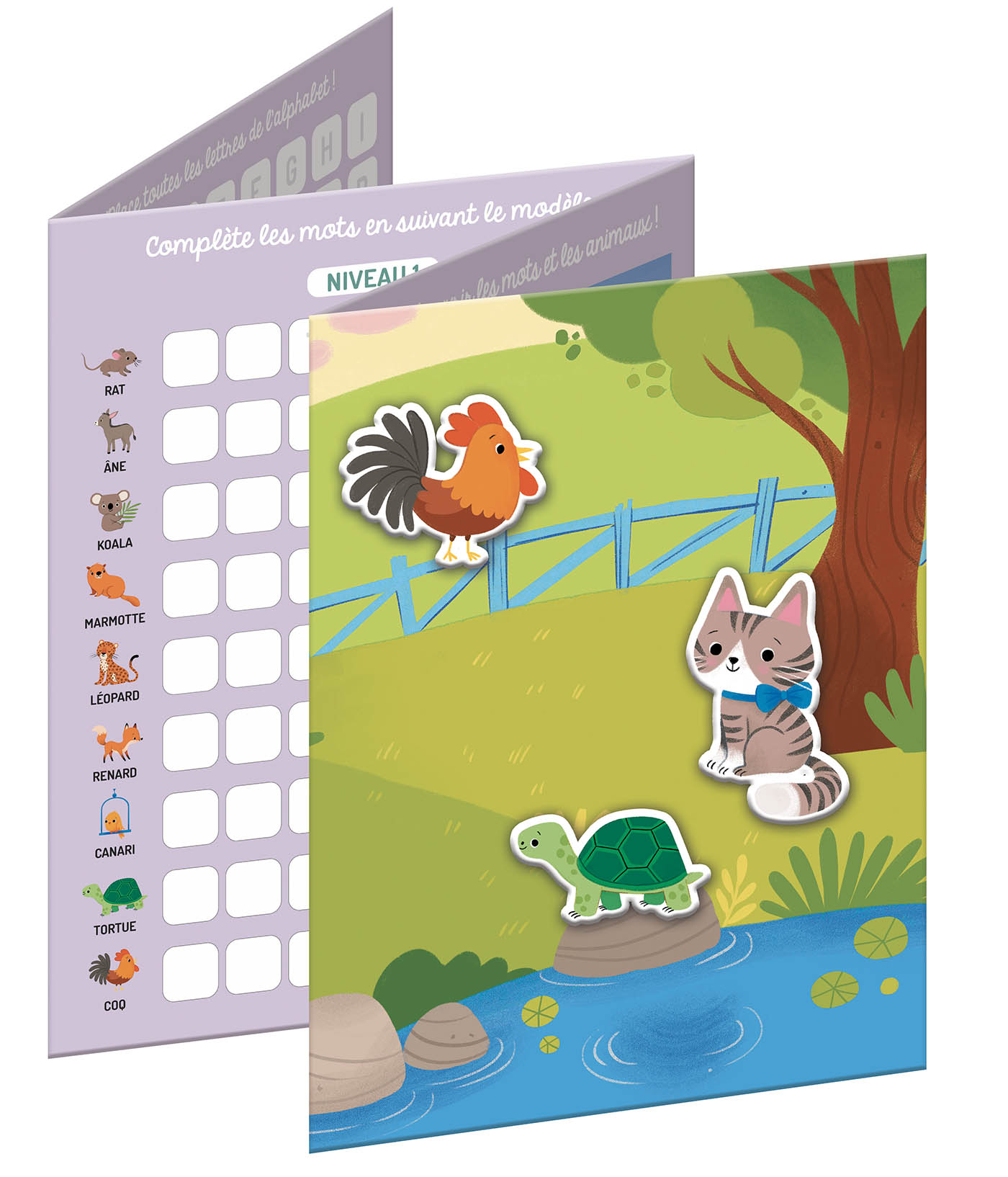 On débute avec l’alphabet, puis plus de 20 mots à recomposer avec les 70 aimants. Les enfants sont accompagnés grâce aux modèles.