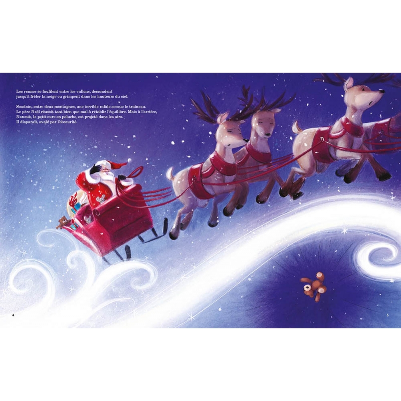 La veille de la longue nuit magique, tandis que les aurores boréales dansent dans le ciel du pôle Nord, l’attelage du père Noël s’envole au-dessus de la banquise. Mais à l’arrière, Nanouk, l’ourson en peluche, est mal attaché. Il plonge dans le noir. C’est le début d’une grande et merveilleuse aventure…