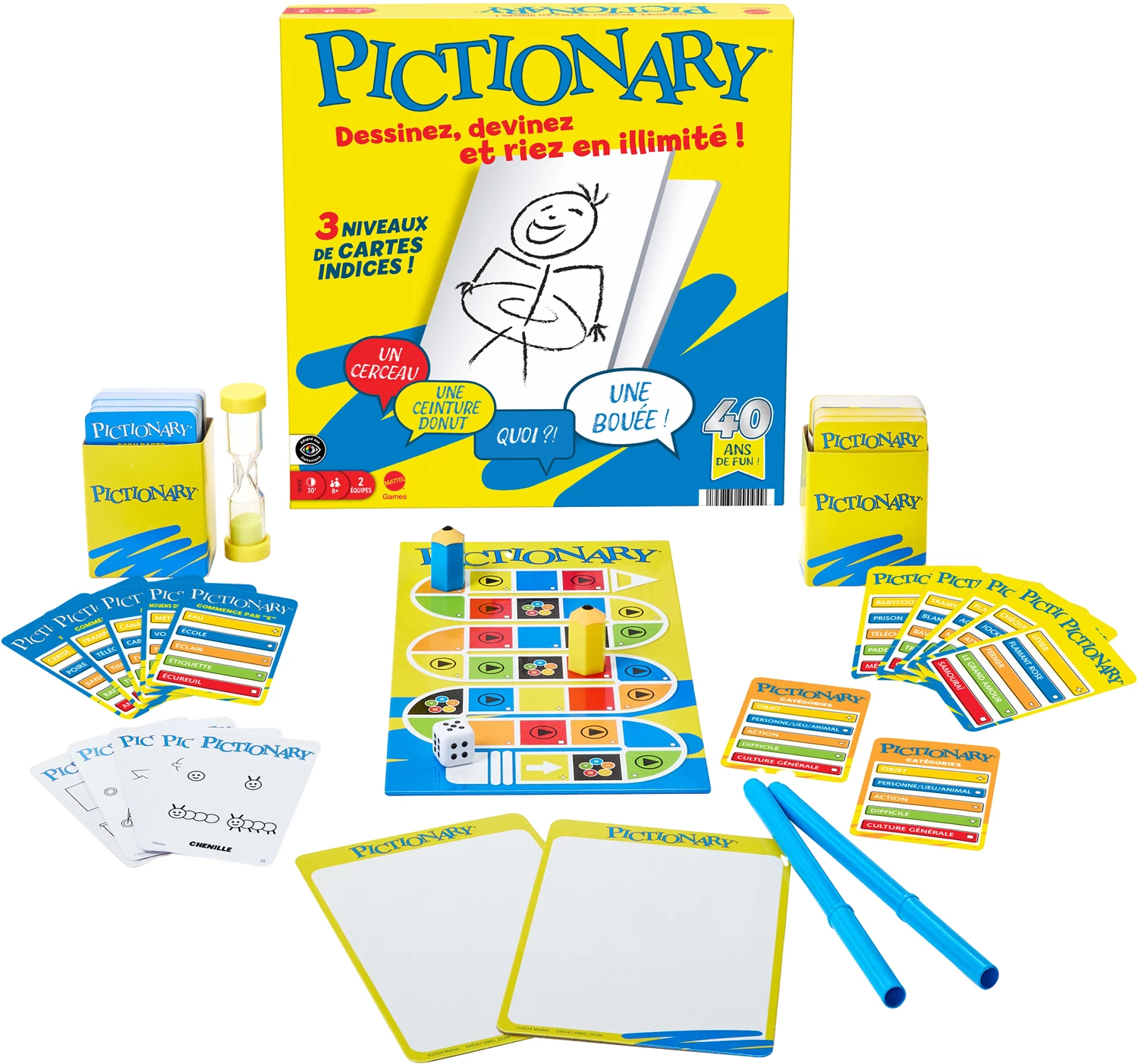 Le Pictionary est un jeu de société familial intemporel qui consiste à réaliser rapidement des dessins et proposer des suggestions souvent très drôles ! Dans ce jeu vraiment très amusant, à tour de rôle, un membre d’une équipe réalise un dessin tandis que le reste de l’équipe doit deviner de quoi il s’agit. Choisissez parmi 3 niveaux d’indices afin que même les plus jeunes puissent participer. Nul besoin d’être un artiste. Souvent, les suggestions sont encore plus hilarantes que les croquis !
